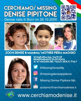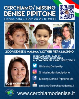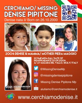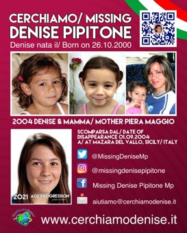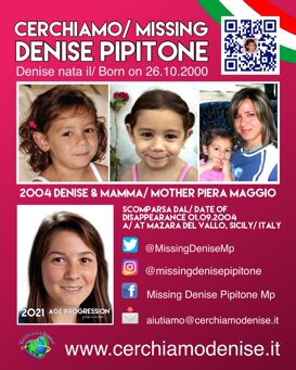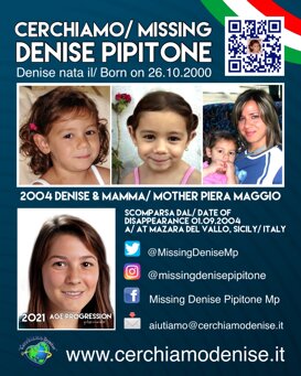 Please, help us find Denise Denise Pipitone was born on 26/10/2000, in Mazara del Vallo (TP) Sicily / Italy. Denise was abducted at Mazara del Vallo in the province of Trapani on 1st September 2004 when she was 4 years old. If you have any information about her whereabouts please contact your nearest police station immediately. Thank You